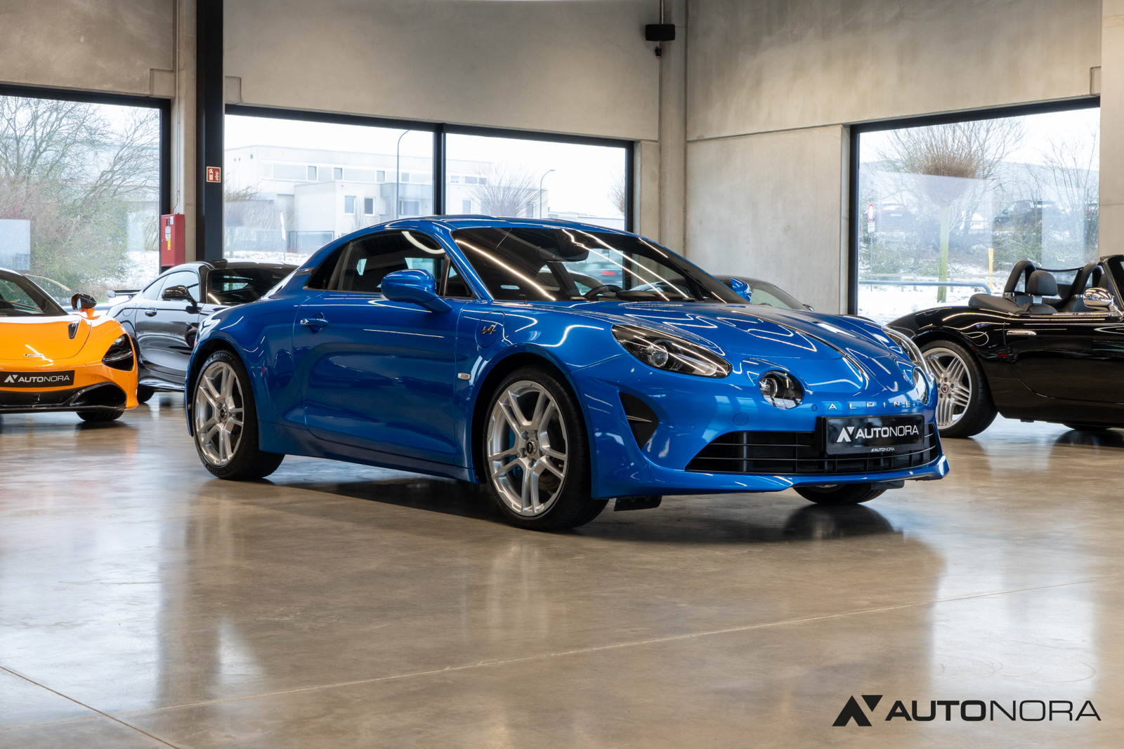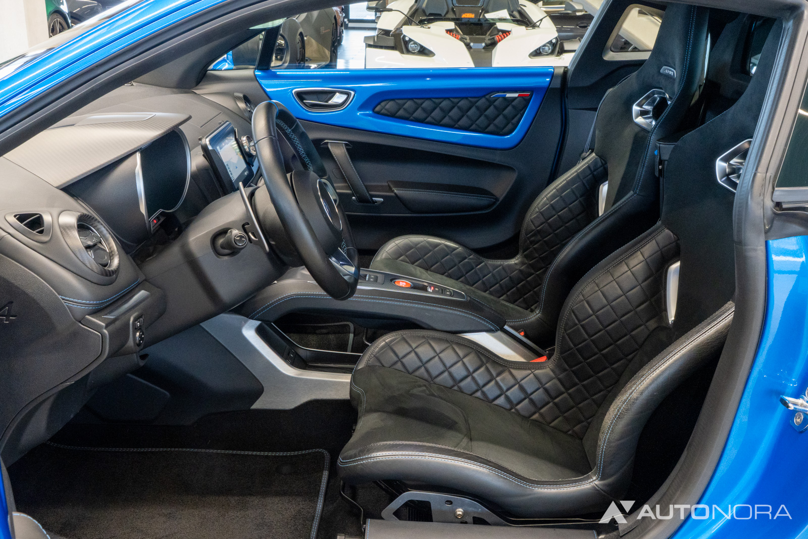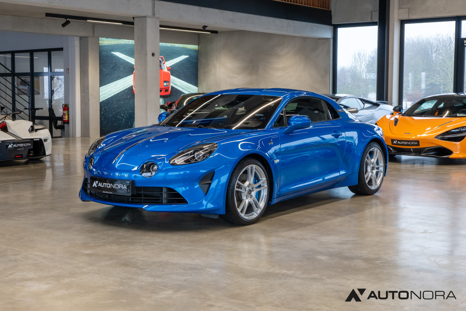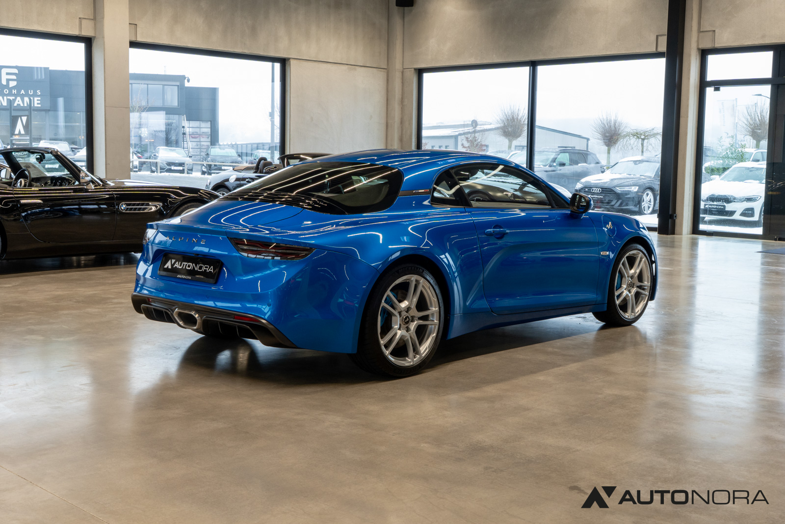 Innenausstattung Dinamica, Ablage-Paket (Ablagefach hinter Beifahrersitz, Gepäcknetz hinter Beifahrersitz), Aktive Sport-Abgasanlage, Alpine Logo auf den Kotflügeln vorne, Aluminium Pedalerie, Einparkhilfe vorn und hinten inklusive Rückfahrkamera, Farbige Bremssättel in Bleu Alpine, Fußmatten mit Ledereinfassung und Alpine-Logo, Fußstütze Beifahrer Aluminium, 18-Zoll Leichtmetallräder von Fuchs, Lenkrad mit blauem Alpine-Logo in der Mitte, Sicht-Paket (Außenspiegel elektrisch verstell-, heiz- und anklappbar, Innenspiegel mit Abblendautomatik), Sound-System Focal High Performance Sound Premium