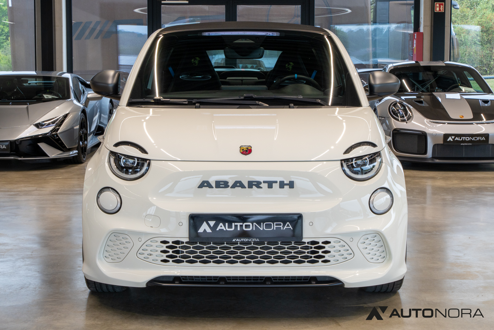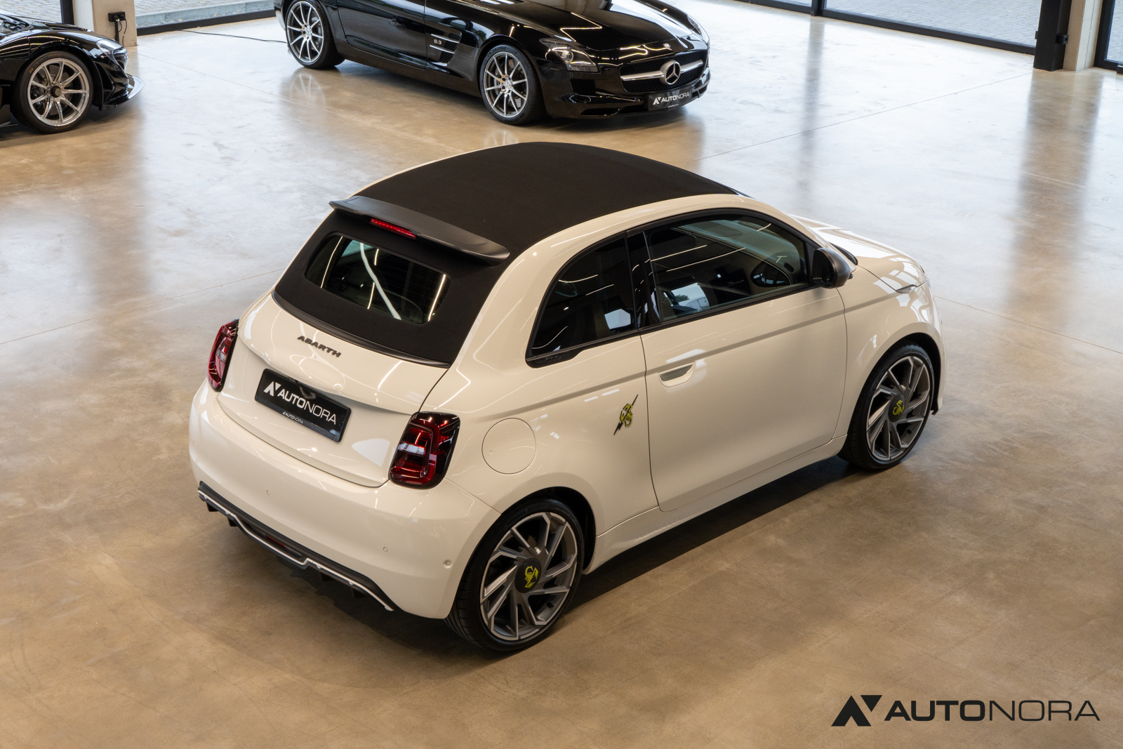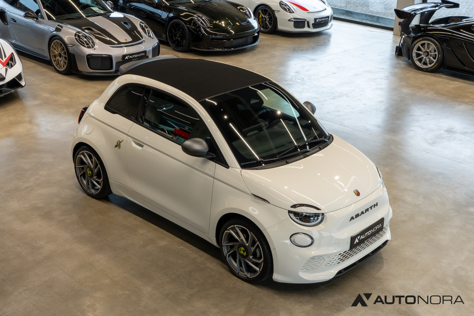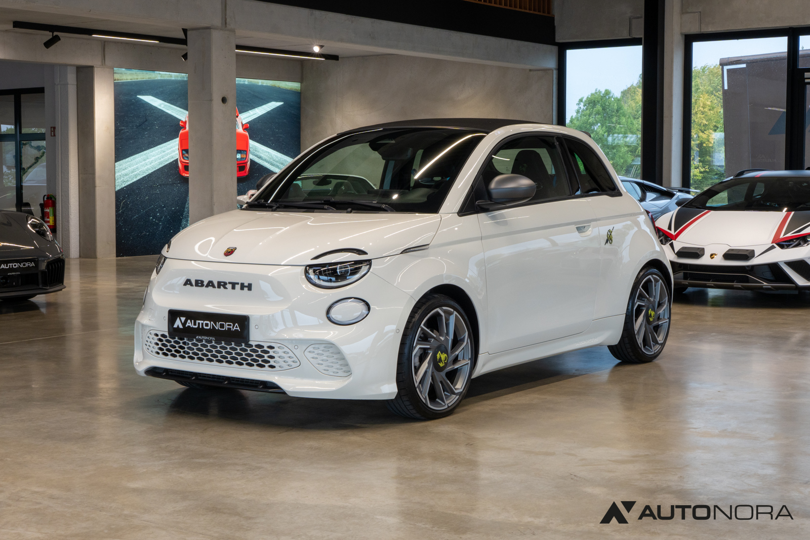 Premium sports seats with Alcantara embossing, sporty double stitching and integrated headrest, heated front seats, Abarth driving modes (Turismo, Scorpion Street, Scorpion Track), Apple CarPlay / Android Auto, Abarth sound generator, dashboard insert in matte black Alcantara, asymmetrically split rear seat backrest, heated windscreen wiper resting area, exterior mirror caps in Titanium Grey, automatically dimming interior mirror, digital 7" TFT color display, digital radio reception (DAB), 360° Drone View parking sensors with HD rear-view camera, dark interior ambience (pillar trim and headliner), stainless steel door sills with Abarth relief, power windows, electrically adjustable and heated side mirrors, electronic parking brake, advanced driver assistance systems (ADAS): autonomous emergency braking assistant, lane departure warning, driver attention assistant, traffic sign recognition, intelligent speed assistant, e-Call assistant, blind spot assistant, EV/PHEV Mode-2 charging cable, EV/PHEV Mode-3 charging cable, driver’s seat with memory function, tinted rear side windows, height-adjustable steering wheel, JBL premium audio system, wireless smartphone charging pad, Keyless Entry & Go, automatic climate control, rear headrests, 6 speakers, LED Infinity headlights, LED daytime running lights and LED taillights, 18-inch alloy wheels with diamond cut in Titanium Grey, light and rain sensor, front center armrest, one-pedal driving, premium three-spoke sport steering wheel with Alcantara embossing and 12 o’clock marker, tire pressure monitoring system without specific pressure display (TPMS), 12V socket in the trunk, 85-kW DC fast charging system, black convertible top, sporty steel pedal covers and footrest with Abarth scorpion, cruise control, Uconnect 10.25" touchscreen radio with integrated navigation system, USB ports type A + C in the center console, heat-insulating glass