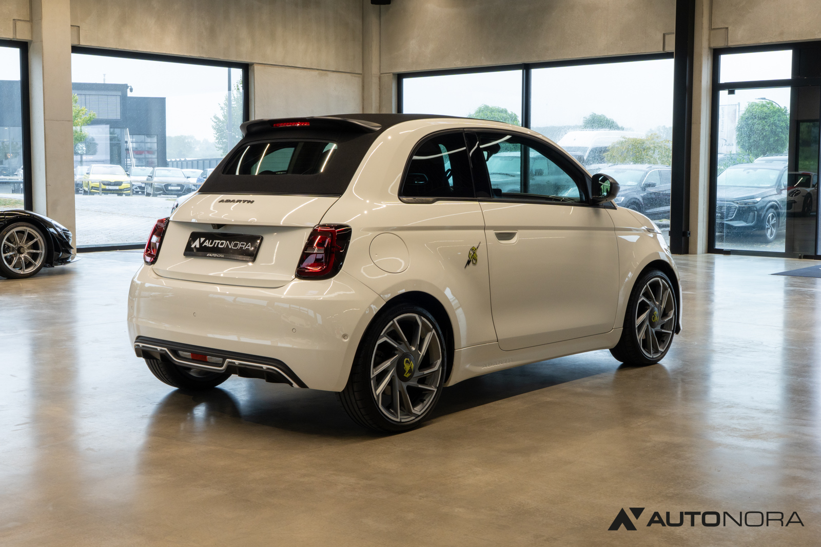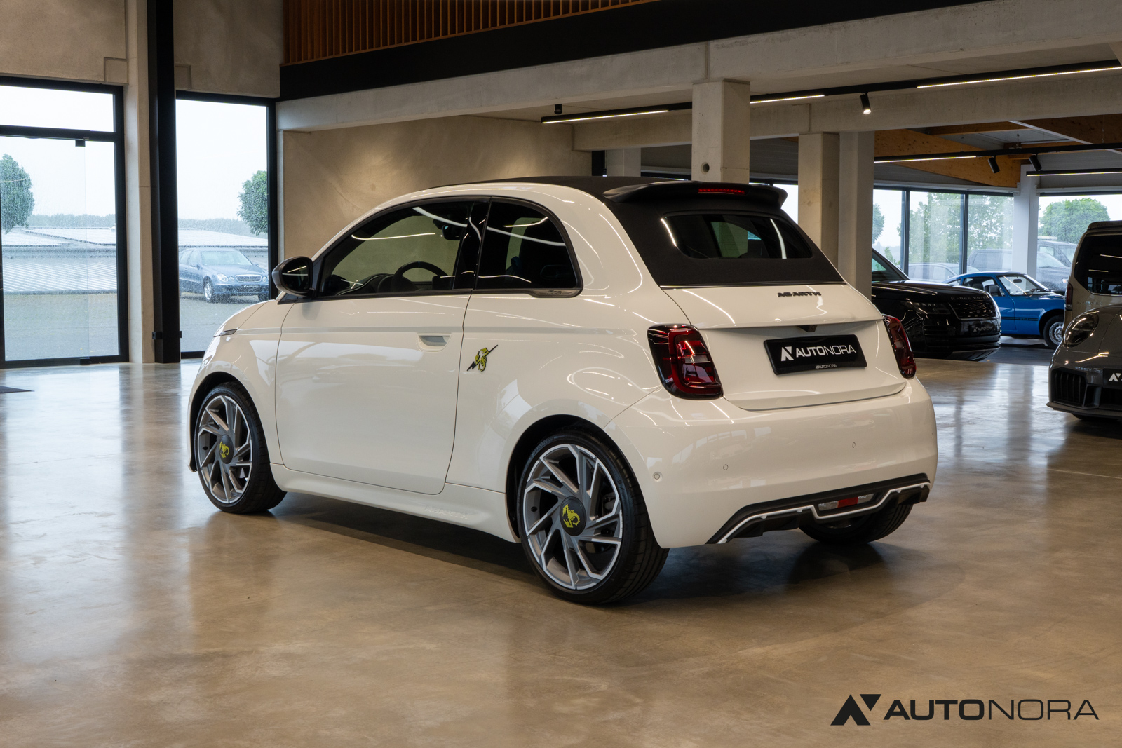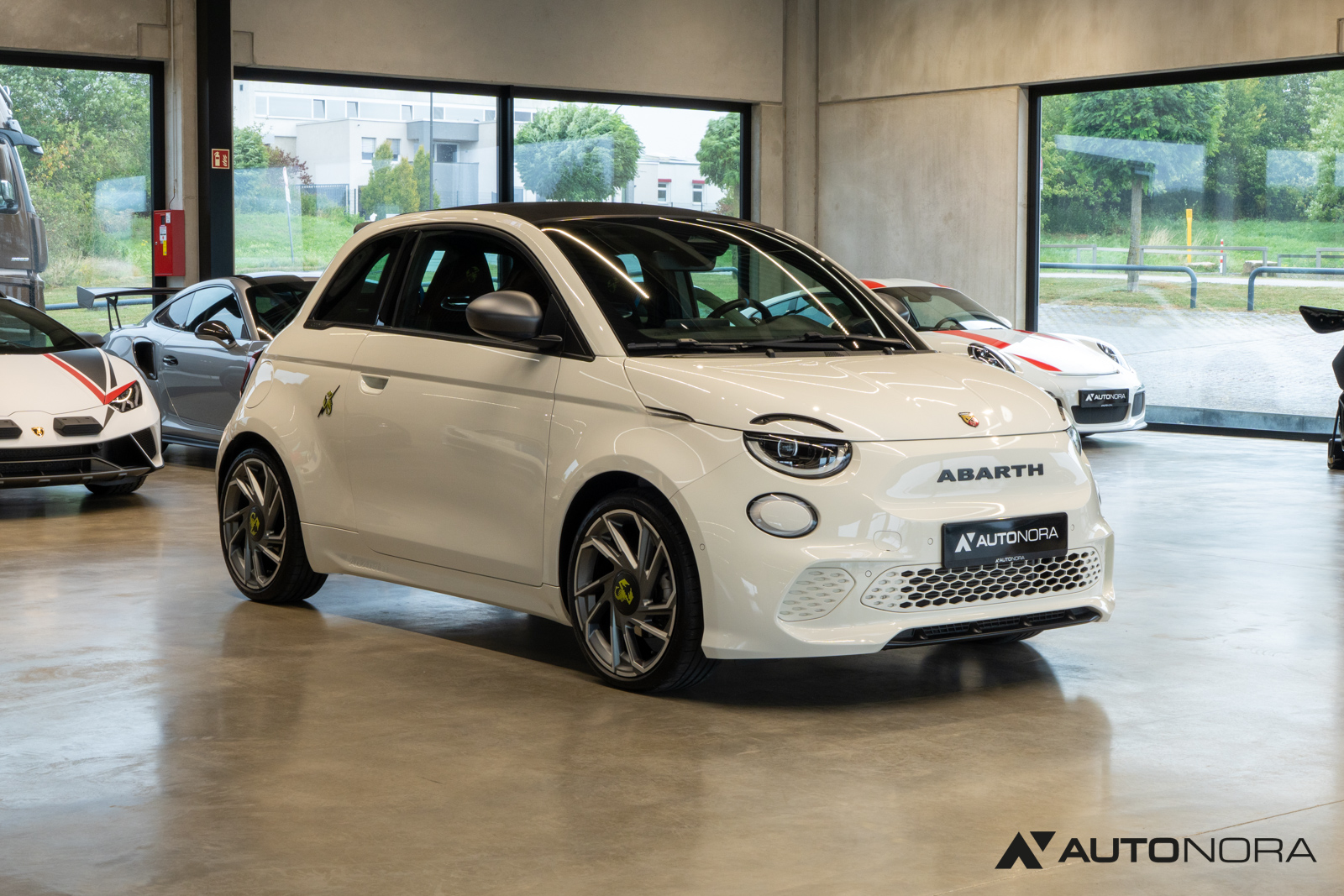 Premium sports seats with Alcantara embossing, sporty double stitching and integrated headrest, heated front seats, Abarth driving modes (Turismo, Scorpion Street, Scorpion Track), Apple CarPlay / Android Auto, Abarth sound generator, dashboard insert in matte black Alcantara, asymmetrically split rear seat backrest, heated windscreen wiper resting area, exterior mirror caps in Titanium Grey, automatically dimming interior mirror, digital 7" TFT color display, digital radio reception (DAB), 360° Drone View parking sensors with HD rear-view camera, dark interior ambience (pillar trim and headliner), stainless steel door sills with Abarth relief, power windows, electrically adjustable and heated side mirrors, electronic parking brake, advanced driver assistance systems (ADAS): autonomous emergency braking assistant, lane departure warning, driver attention assistant, traffic sign recognition, intelligent speed assistant, e-Call assistant, blind spot assistant, EV/PHEV Mode-2 charging cable, EV/PHEV Mode-3 charging cable, driver’s seat with memory function, tinted rear side windows, height-adjustable steering wheel, JBL premium audio system, wireless smartphone charging pad, Keyless Entry & Go, automatic climate control, rear headrests, 6 speakers, LED Infinity headlights, LED daytime running lights and LED taillights, 18-inch alloy wheels with diamond cut in Titanium Grey, light and rain sensor, front center armrest, one-pedal driving, premium three-spoke sport steering wheel with Alcantara embossing and 12 o’clock marker, tire pressure monitoring system without specific pressure display (TPMS), 12V socket in the trunk, 85-kW DC fast charging system, black convertible top, sporty steel pedal covers and footrest with Abarth scorpion, cruise control, Uconnect 10.25" touchscreen radio with integrated navigation system, USB ports type A + C in the center console, heat-insulating glass