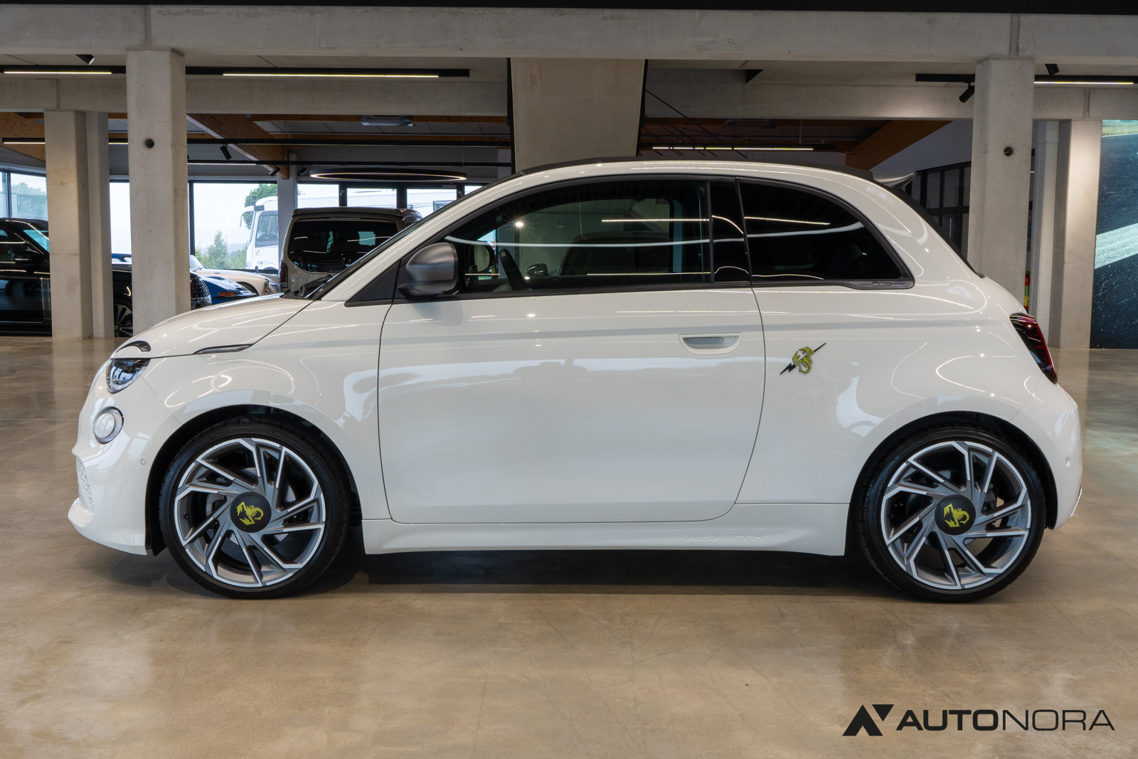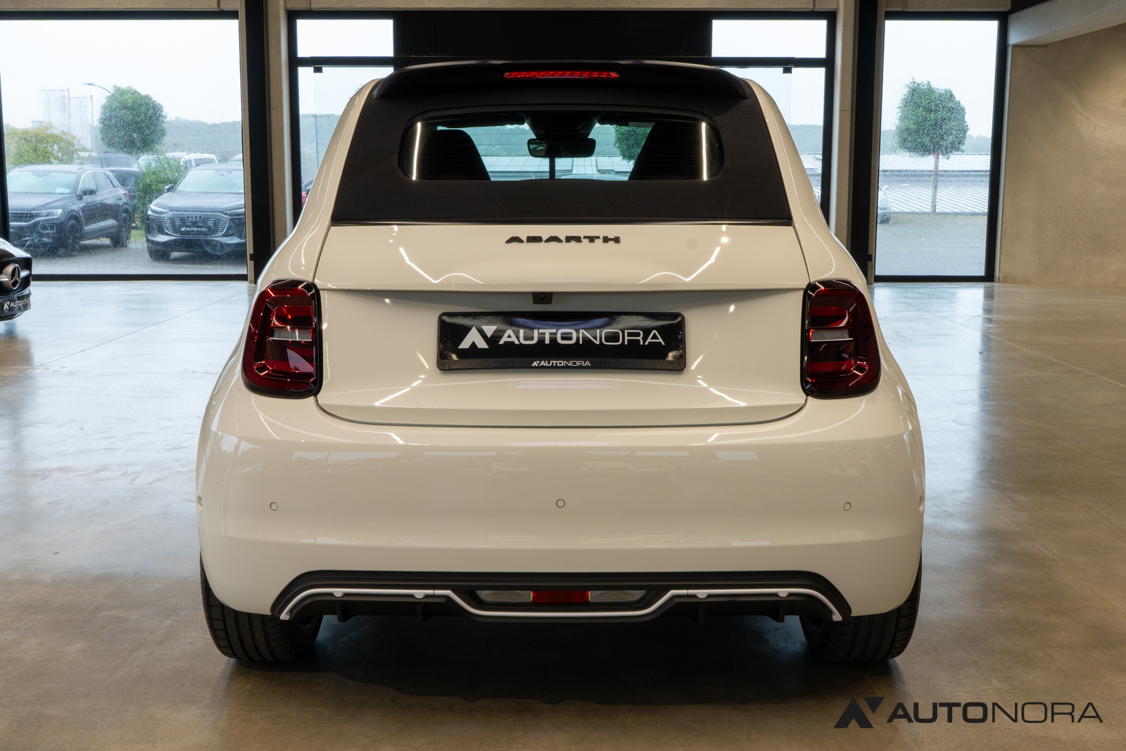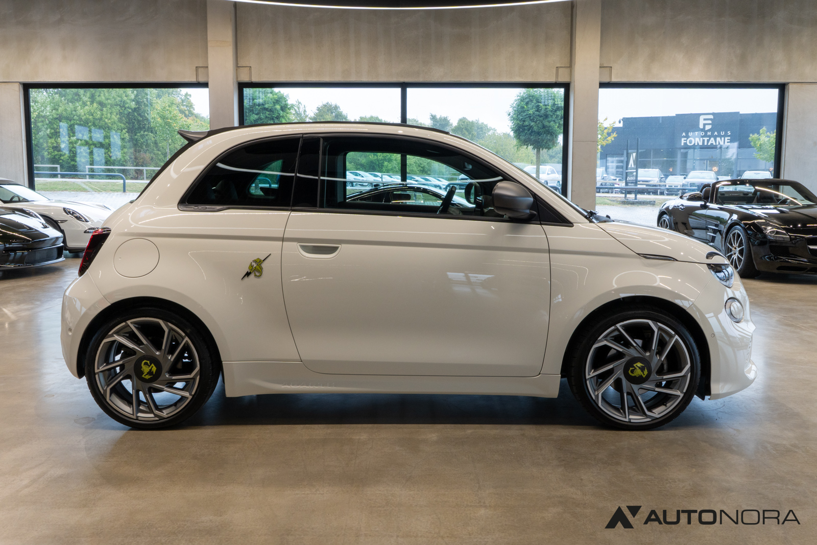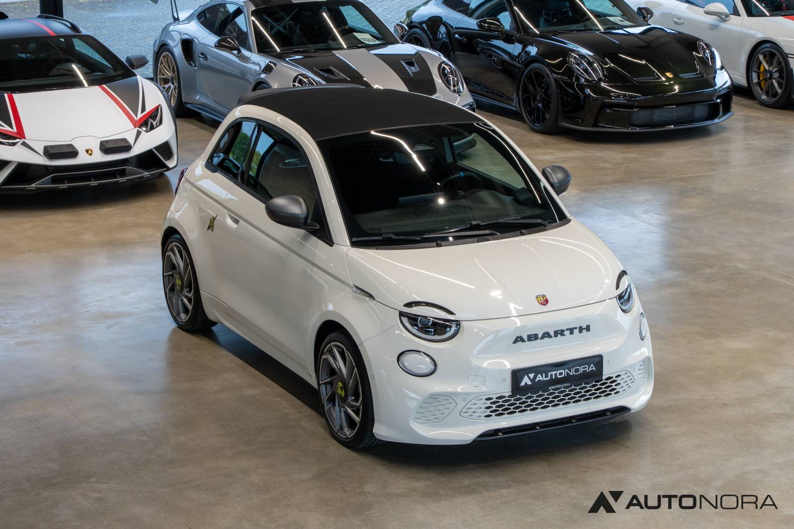 Premium sports seats with Alcantara embossing, sporty double stitching and integrated headrest, heated front seats, Abarth driving modes (Turismo, Scorpion Street, Scorpion Track), Apple CarPlay / Android Auto, Abarth sound generator, dashboard insert in matte black Alcantara, asymmetrically split rear seat backrest, heated windscreen wiper resting area, exterior mirror caps in Titanium Grey, automatically dimming interior mirror, digital 7" TFT color display, digital radio reception (DAB), 360° Drone View parking sensors with HD rear-view camera, dark interior ambience (pillar trim and headliner), stainless steel door sills with Abarth relief, power windows, electrically adjustable and heated side mirrors, electronic parking brake, advanced driver assistance systems (ADAS): autonomous emergency braking assistant, lane departure warning, driver attention assistant, traffic sign recognition, intelligent speed assistant, e-Call assistant, blind spot assistant, EV/PHEV Mode-2 charging cable, EV/PHEV Mode-3 charging cable, driver’s seat with memory function, tinted rear side windows, height-adjustable steering wheel, JBL premium audio system, wireless smartphone charging pad, Keyless Entry & Go, automatic climate control, rear headrests, 6 speakers, LED Infinity headlights, LED daytime running lights and LED taillights, 18-inch alloy wheels with diamond cut in Titanium Grey, light and rain sensor, front center armrest, one-pedal driving, premium three-spoke sport steering wheel with Alcantara embossing and 12 o’clock marker, tire pressure monitoring system without specific pressure display (TPMS), 12V socket in the trunk, 85-kW DC fast charging system, black convertible top, sporty steel pedal covers and footrest with Abarth scorpion, cruise control, Uconnect 10.25" touchscreen radio with integrated navigation system, USB ports type A + C in the center console, heat-insulating glass