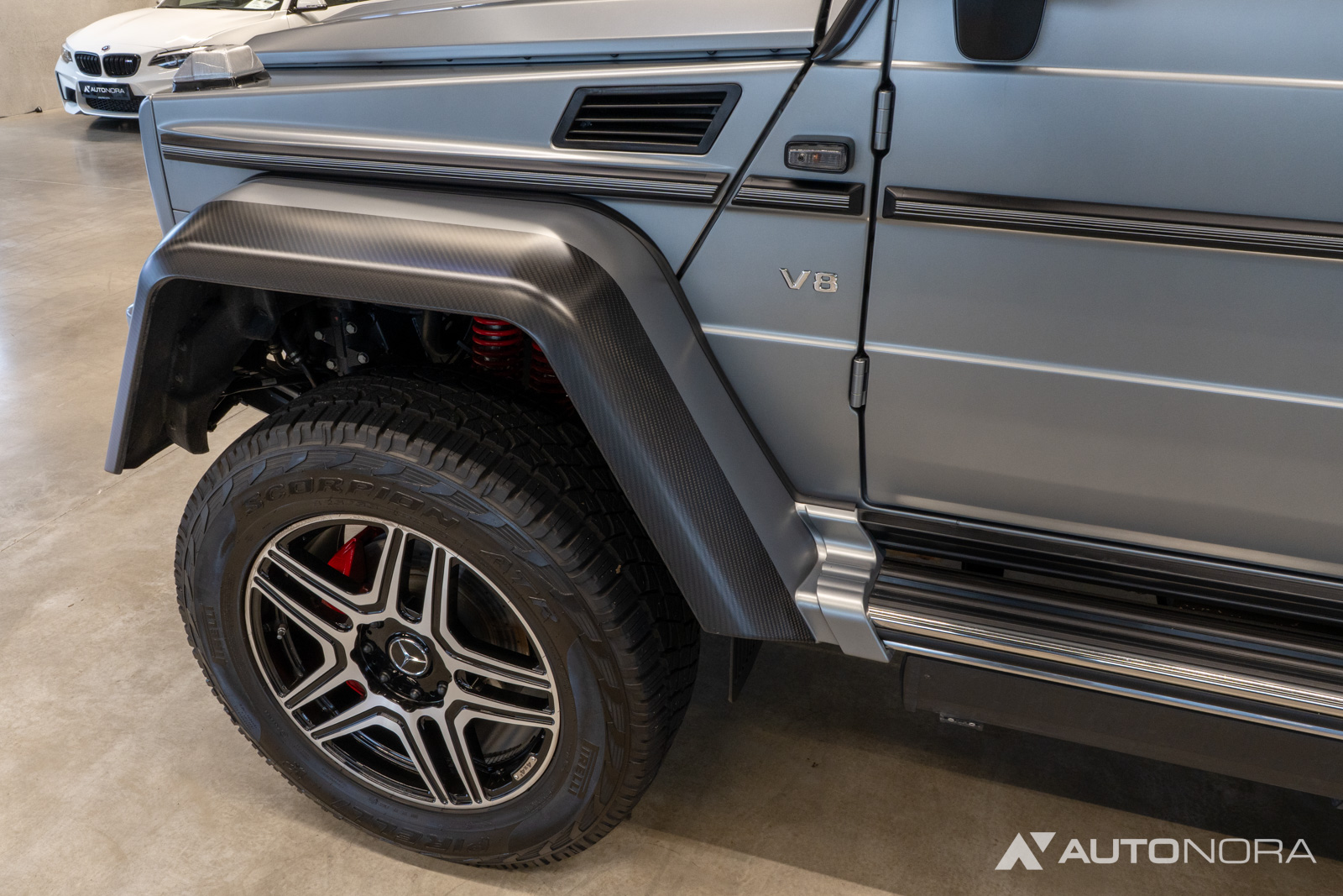 22-inch light-alloy wheels in 5-twin-spoke design painted black and high-sheen turned, 4x42 badge on the rear, AMG Performance steering wheel leather Nappa/microfiber Dinamica, AMG carbon trim elements, Armrest with universal interface Universal Cradle, extended phone function, charging function and external antenna for optimal reception, exterior protective strip with insert in stripe design, in-car telephony in the armrest for phone and internet connectivity with separate SIM card reader, Brabus rear silencer, Brabus side steps, chrome rings around the front door speakers, roof and Mercedes star surround in radiator grille in designo night black magno, front spoiler in visible carbon black matte including LED headlamps (non-functional), designo headliner microfiber Dinamica black, anti-theft alarm system (EDW) with tow-away protection and interior security, stainless steel illuminated door sill panels with “Mercedes-Benz” lettering, 4x, front, fire extinguisher mounted in front of driver’s seat, front and rear floor mats in velour with contrast stitching white, Harman Kardon Logic 7 surround sound system, high-performance brake system, brake calipers and springs front and rear painted red, instrument panel in black leather, radiator grille with 3-lamella design, radiator grille with chrome inserts, trunk mat with insert in diamond pattern microfiber Dinamica black and contrast stitching white, loading edge protection with “Mercedes-Benz” lettering, cargo net, multicontour seats and seat ventilation/climate for driver and front passenger, upholstery leather & microfiber Dinamica microfiber Dinamica with side bolsters in designo leather Nappa black, portal axles front and rear with portal gears at axle heads and portal supports, rearview camera, electric sunroof with tilt function, seat cushions and door center panels in microfiber DINAMICA with diamond stitching, sport exhaust system with two side-mounted polished stainless steel tailpipes, sport steering wheel with microfiber Dinamica/leather application, bumper consisting of specific front apron with black; air intakes painted in body color and fender extensions partly in body color and partly in visible carbon black matte, auxiliary heater with remote control, tirefit, TV tuner for digital television reception, underguard 2-fold in brushed stainless steel (rear) and underguard panels front and rear in brushed stainless steel, adjustable damping two gas-pressure spring struts per wheel, button on lower control panel for sporty or comfort suspension setting and integrated safety level, V8 badge on vehicle sides, shift lever with leather insert in leather Nappa black with chrome trim, white stitching on seats, headrests, door handles, armrests and handbrake, white stitching on instrument panel in conjunction with designo exclusive package, heat-insulating dark tinted glass for rear side windows and rear window, heated windshield, two high-quality side steps left and right, continuous chrome strips on the wood trim of the seat adjustment switches, AMG carbon trim elements