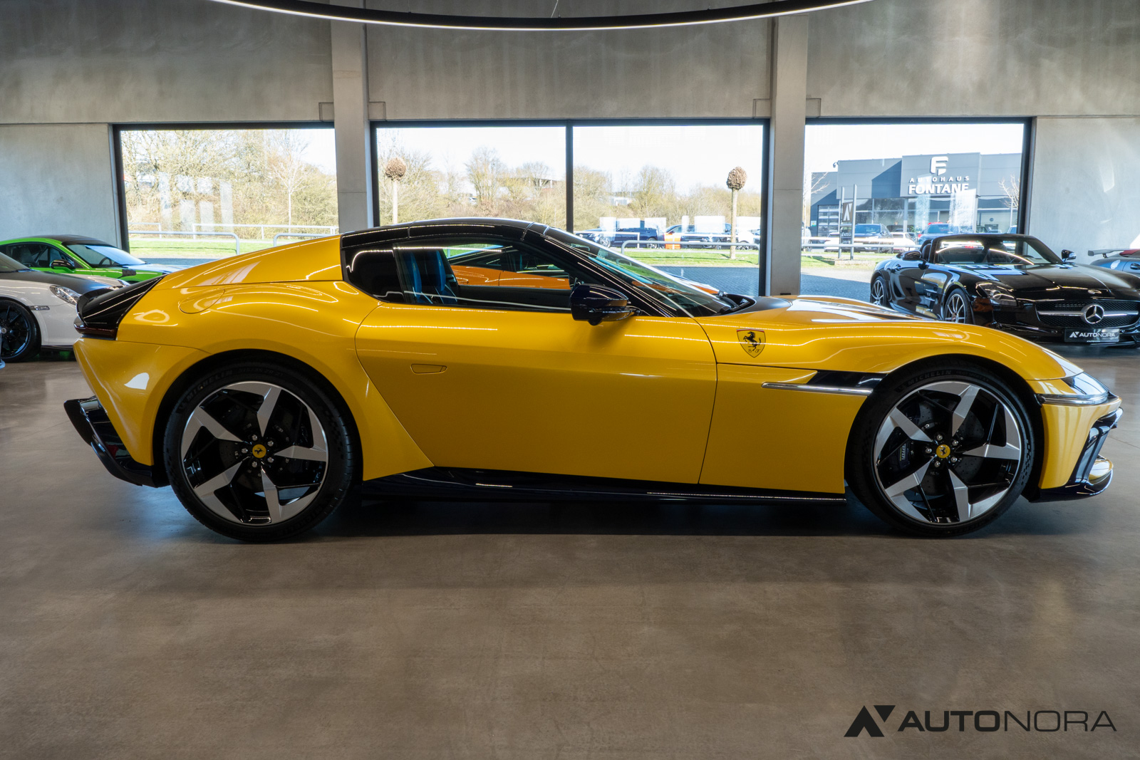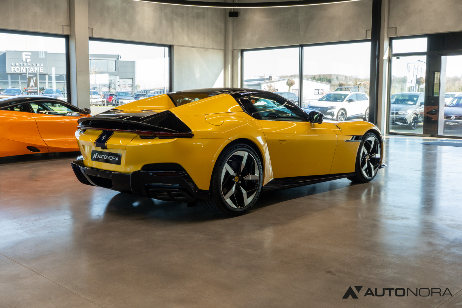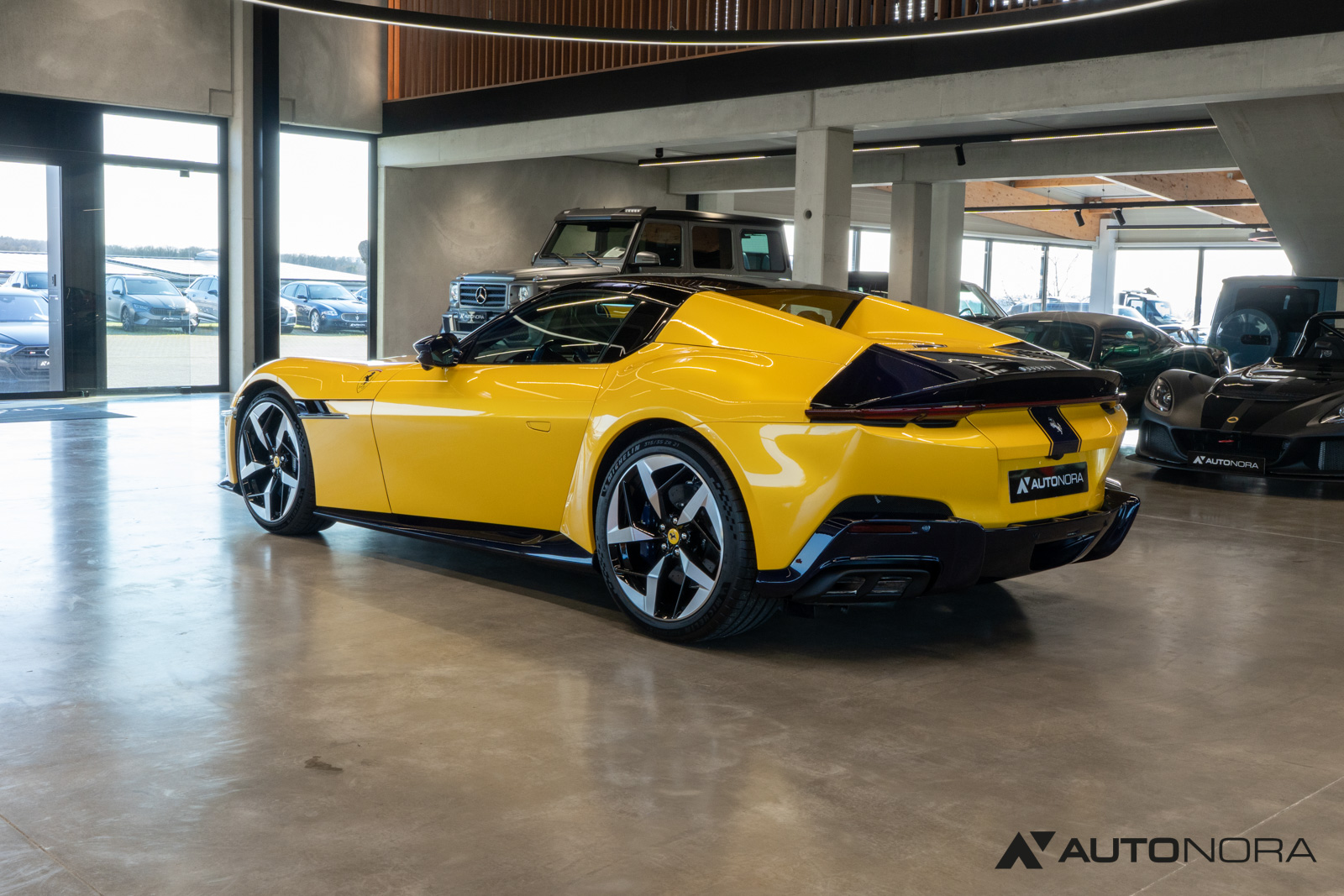 ACC1 Radar avant avec ACC, ALDT Détails en Alcantara spécial Giallo Modena (ALTX), ALOG Logos Scuderia Ferrari peints, BFSA Emblème Ferrari mat sur les seuils de porte, BIC2 Carrosserie bicolore, CALC Étriers de frein en bleu, CECM Carrosserie extérieure en carbone spécial bleu brillant, CEFB Cache-filtre à air en carbone, CEL2 Cache-moteur en carbone, CEXD Diffuseur en carbone spécial bleu (CEDX), CEXG Prises d'air avant en carbone spécial bleu (CEGX), CEXS Bas de caisse en carbone spécial bleu (CEXX), CEXW coques de rétroviseurs en carbone spécial bleu (CEMX), CICM intérieur spécial en carbone bleu brillant, CIIP cockpit en carbone spécial bleu (CIPX), CIPZ panneaux de porte en carbone spécial bleu (CPZX), CISK seuils de porte en carbone spécial bleu (CISX), CITZ tunnel central en carbone spécial bleu (CUTX), COAC MyFerrari Connect activé, DSAX tableau de bord en Alcantara spécial Blu Elettrico, ELEV système de levage, EMPH Cavallino brodé sur les appuie-tête en giallo (jaune), EXAB embouts d'échappement sport noirs, FCWS spoiler avant en carbone spécial bleu (FCWX), HAW1 pare-brise en verre athermique, HBSA inscription Ferrari et Cavallino en finition mate, INAX Alcantara de la gamme Extra-Range en Blu Elettrico, volant LEDS avec LED en carbone spécial bleu (LEDX), livrée LI02 SPEC / bandes décoratives Design 2 en Blu Tour de France 70, écran passager PDIS, peinture spéciale PNTE 4 couches, sièges RSCD Daytona Racing en carbone spécial bleu (RSCX), RSFB jantes forgées noir brillant / finition diamant, SMRT interface smartphone, SNDX système audio haut de gamme, STC2 surpiqûres en Giallo (jaune), STW1 volant avec zones de préhension en Alcantara Blu Elettrico (SWAH), SURR Surround View, SWAH volant avec zones de préhension en Alcantara Blu Elettrico, ULEZ partie supérieure en cuir nero (noir), XLED phares avant à LED adaptatifs